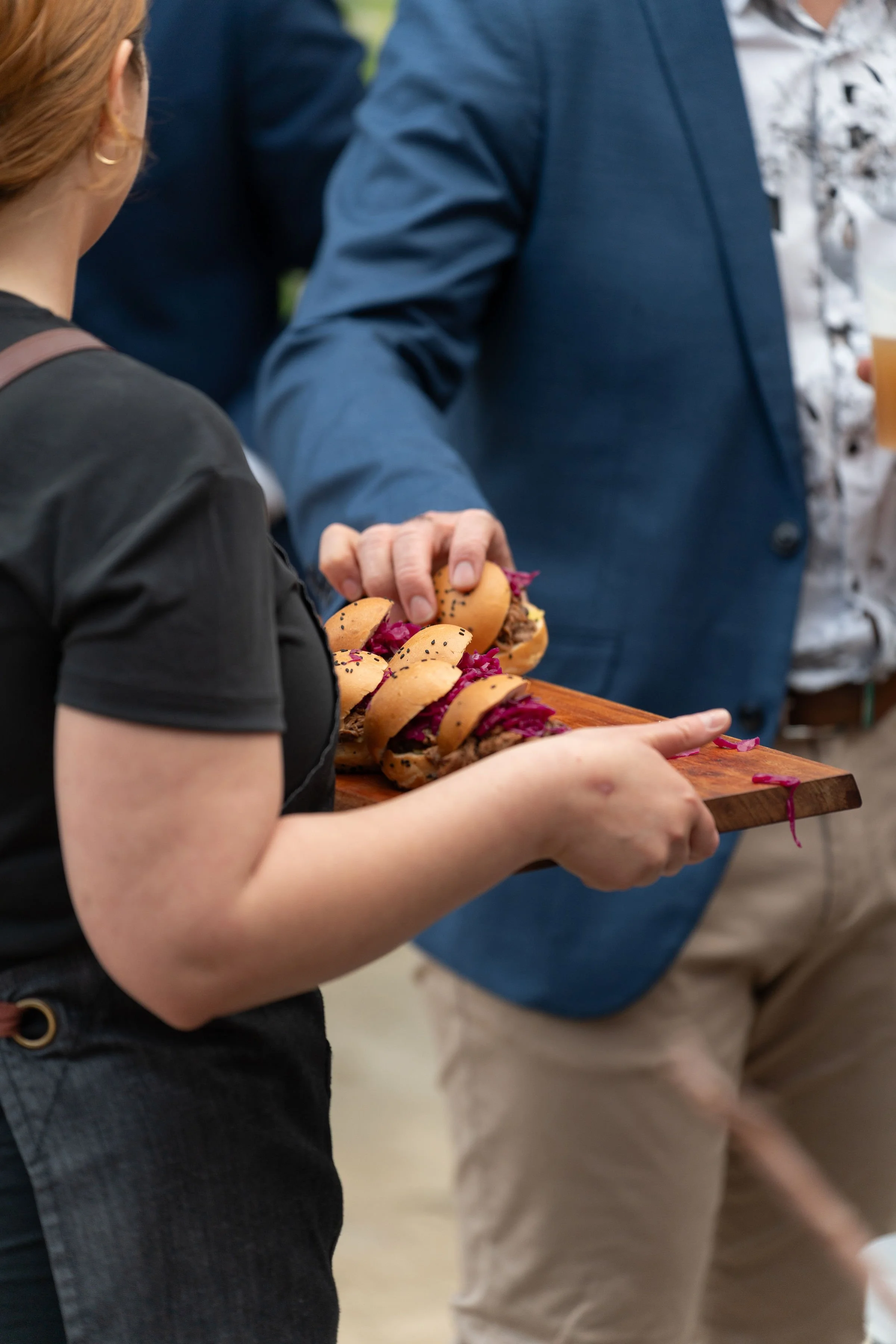 Our team serves canapés as roaming trays, ensuring they are evenly distributed throughout the space so every guest is looked after. This style of service allows guests to stay engaged in conversation while enjoying the food, without needing to line up or leave the moment.