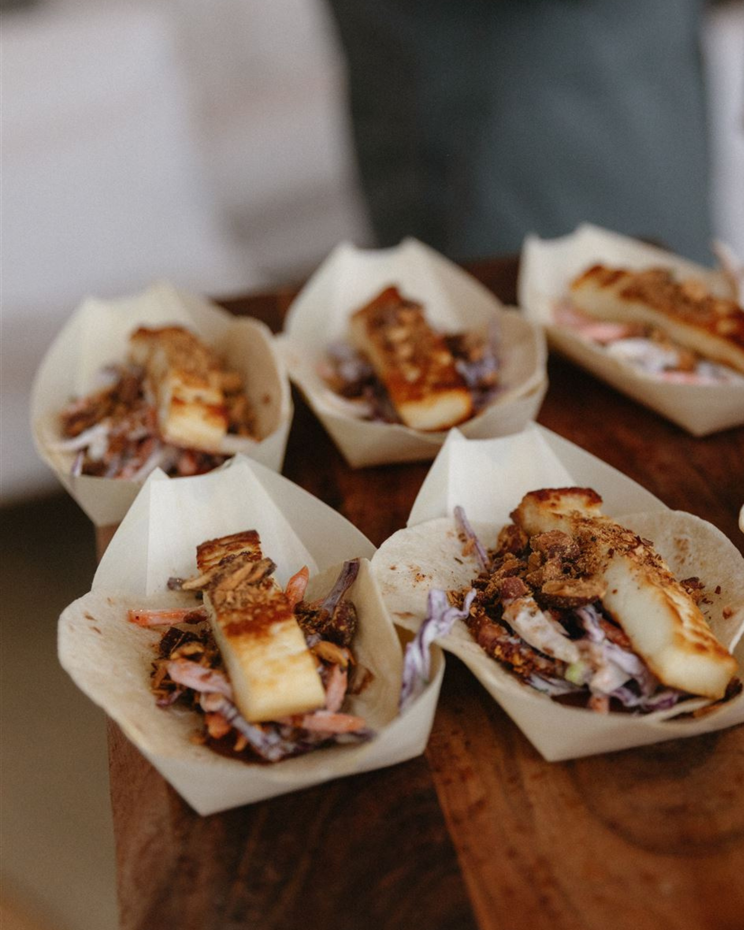 These Grilled Haloumi Soft Tacos are from our taco menu and can be added to your canapé service. Topped with crisp shaved slaw, tangy tomato chutney and crunchy almonds, they make a delicious vegetarian option that your guests will love!